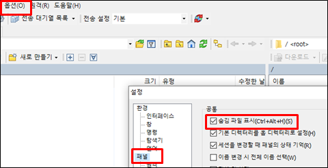 2) sftp 프로그램의 설정에서 hidden 파일 보이도록 설정 : 아래는 WinSCP 기준 예시
