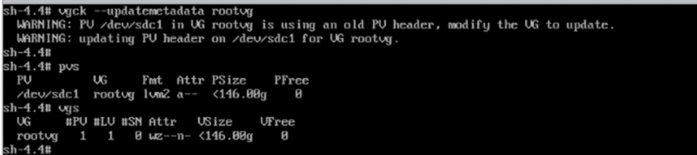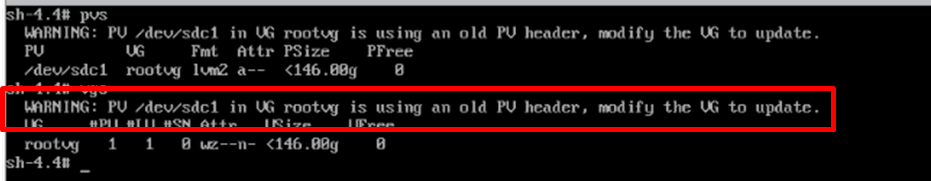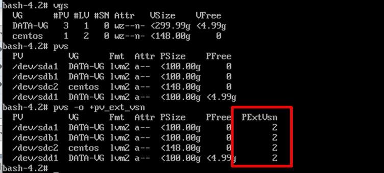 - pvs -o +pv_ext_vsn 수행 결과에서 PExtVsn의 값이 2가 아닐 경우 vgck 수행