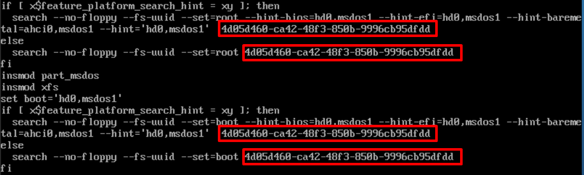 1) /boot/grub2/grub.cfg의 boot, root UUID 변경