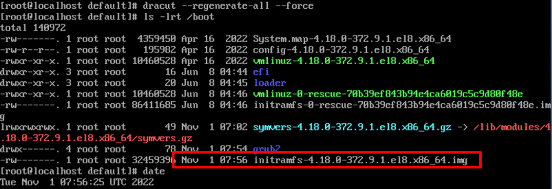# dracut --regenerate-all --force >> initramfs 파일 재생성